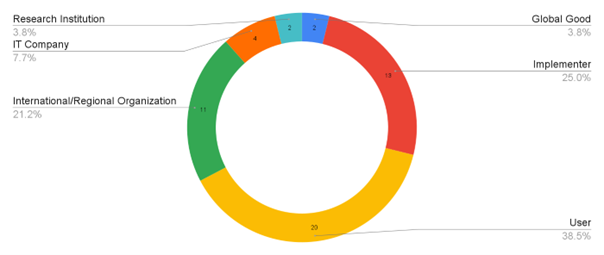 The types of SORMAS ecosystem groups included: users (38,5%), implementers (25%), regional/international organizations (21,2%), and others including IT companies, Global Goods, research institutions, and funders (15,3%).