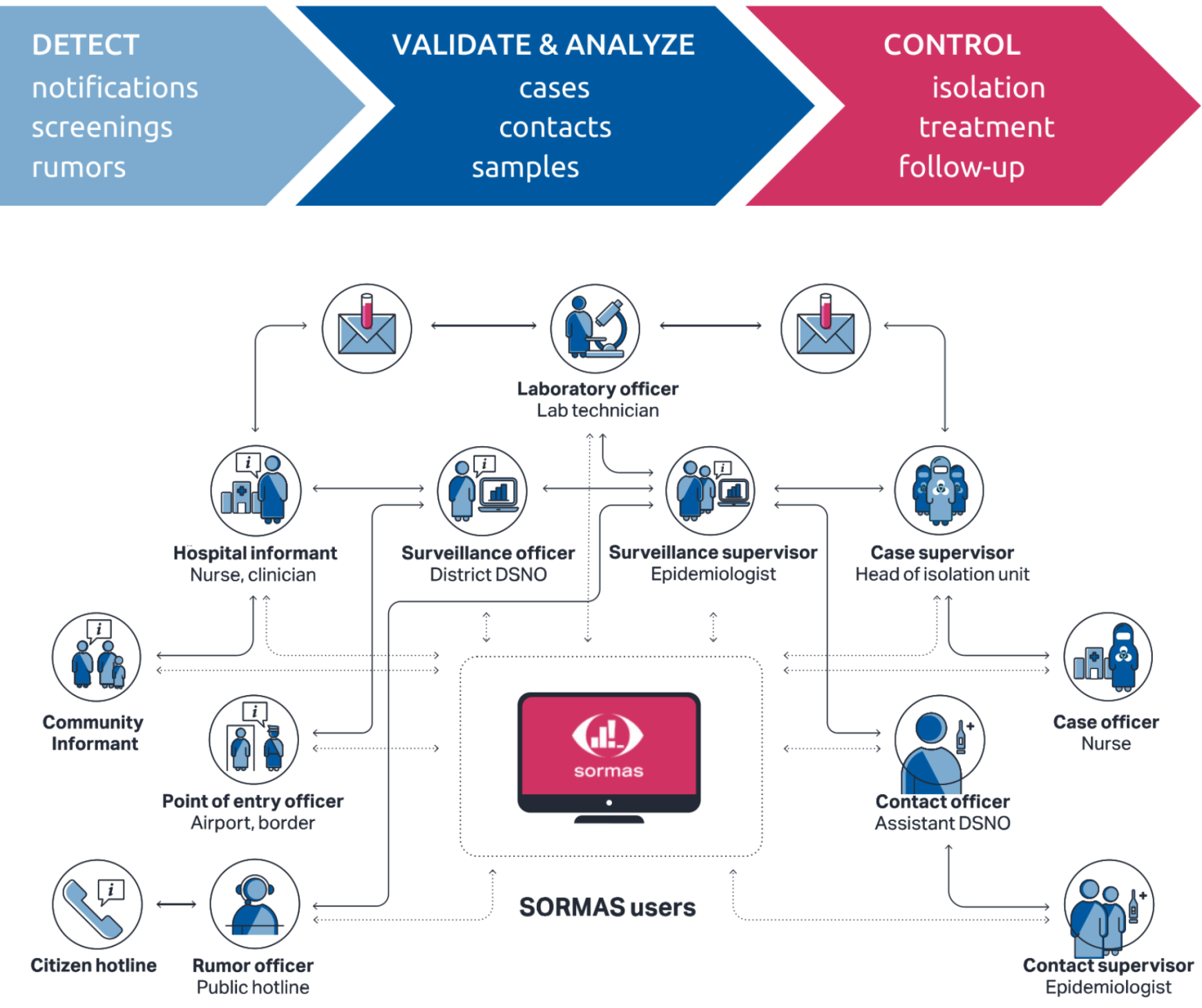 SORMAS is built to ensure data privacy and security, with different user roles and permissions to protect sensitive information. It also facilitates seamless communication and coordination among different public health institutes, such as hospitals, labs, and surveillance officers, streamlining workflows and enhancing collaboration.
